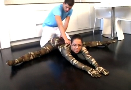 Очкастую девку в камуфляжном спандексе ебёт тренер по растяжке