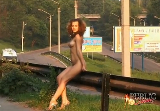 Голая девушка-нудистка гуляет по улице (публичная эротика)