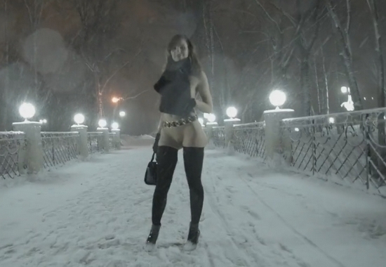 Эротическая прогулка голой красотки по зимнему парку в Москве